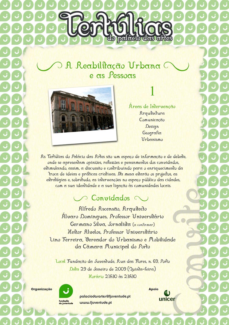 Outra situação tem a ver com os eventos que agora, felizmente, vão ocorrendo quase como cogumelos na cidade, foram as  conferências Crítica do Contemporâneo de 2008 em Serralves,  é agora o ciclo a A Reabilitação Urbana e as Pessoas no Palácio das Artes, as Conferências do Palácio 2009 da ACP, os imensos eventos da Fnac, os outros eventos da Almedina, e tantos outros que nem sei que existem e que não vou poder / ouvir… a minha pergunta é será assim tão dispendioso gravar pelo menos o som desses eventos? Não estou a falar de nada elaborado estou somente a dizer que o microfone que quase de certeza usam, em vez de ir directo para os altifalantes passa primeiro por um simples pc e gravam o que aí foi dito. Será assim tão difícil e / ou dispendioso?